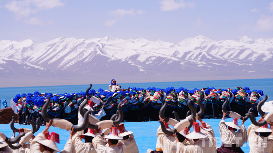 念青唐古拉山脈皚皚雪山高聳入云,清澈碧藍的納木錯湖水一望無際,牧民牽著白牦牛在湖邊悠閑地散步,成群的棕頭鷗發(fā)出歡快的叫聲在空中自由飛翔……在令人如癡如醉的絕美景色為背景的祈福儀式上,身著盛裝的300名演員結(jié)合當(dāng)?shù)孛袼孜幕?,手捧哈達、牛角、烏爾朵(拋石器)等呈現(xiàn)盛大的祈福儀式,給現(xiàn)場觀眾帶來一場羌塘高原別具一格的視覺盛宴。