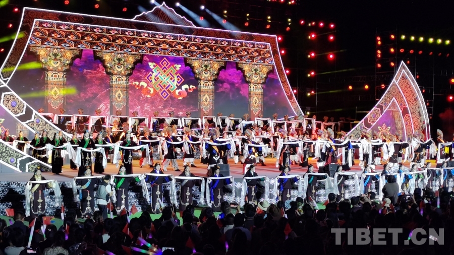 現(xiàn)場舞臺以藏族傳統(tǒng)手工藝品火鐮為造型,富有創(chuàng)造力地展示出盛德白玉的人文內(nèi)涵。演出現(xiàn)場,由省級非物質(zhì)文化遺產(chǎn)傳統(tǒng)舞蹈手指鍋莊改編的群舞《千年指舞鍋莊》一開場就引起全場歡呼。情景歌舞《精神永存》以金沙江“白格”堰塞湖為背景,講述了白玉縣上下齊心、共同奮戰(zhàn),最終打贏了這場應急救援戰(zhàn)的故事,彰顯了白玉兒女團結奮進、敢作善為的白玉精神。來自白玉縣登龍鄉(xiāng)的群眾身著本地傳統(tǒng)服飾,表演了非物質(zhì)文化遺產(chǎn)——登龍“卓欽”。男子步法粗狂豪邁、英勃剛健,唱腔渾厚、嗓音動人;女子舞蹈動作步法細膩傳神、輕盈瀟灑,唱腔明亮婉轉、嗓音甜美動人以及原始古樸,舞姿舒展,節(jié)奏明快,在舞步舞姿上的舒緩和節(jié)奏上的緩進,于粗獷中更沉穩(wěn),于質(zhì)樸中透中變化,在配男女對唱的優(yōu)美歌聲,極具地方特色,讓現(xiàn)場觀眾直觀地感受到了非遺獨特的文化魅力,一聲聲歡呼和喝彩掀起陣陣高潮。