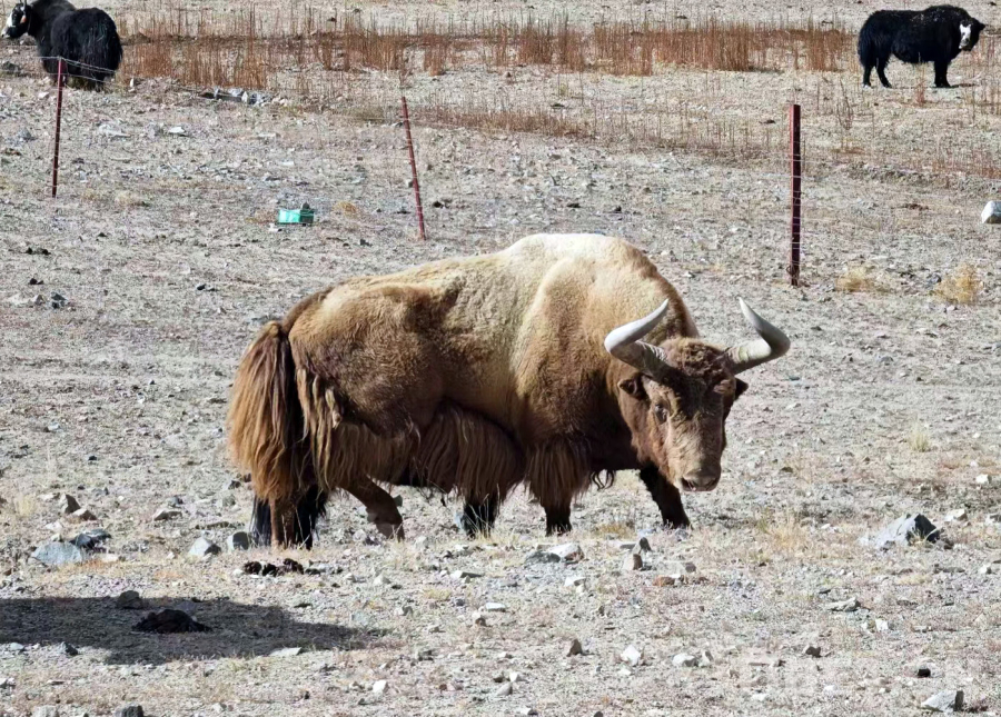 圖為羌塘國家級自然保護(hù)區(qū)的一頭金絲野牦牛與放牧的家畜牦牛和諧相處(革吉縣野保員洛洛提供)