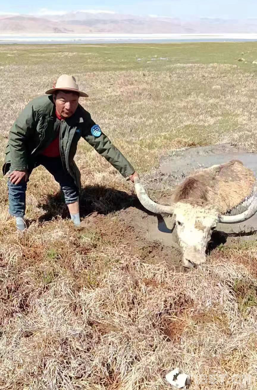 圖為西藏阿里地區(qū)革吉縣野生動物保員正準(zhǔn)備救助一頭陷入沼澤地的金絲野牦牛(野保員洛洛提供圖片)
