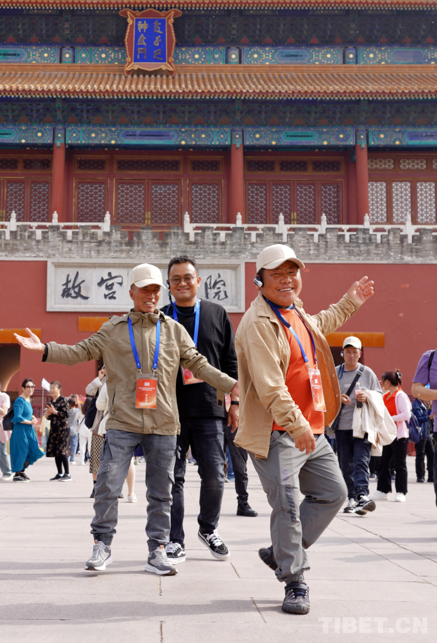 圖為羌塘國家級自然保護(hù)區(qū)尼瑪縣羅布玉杰管理站野保員扎西索朗(右一)在北京故宮博物院參觀時,情不自禁地跳起鍋莊舞(王麒龍2024年4月25日攝)
