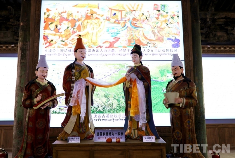 圖為宏覺寺鑄牢中華民族共同體意識體驗館內“唐蕃聯(lián)姻”塑像 攝影:王茜