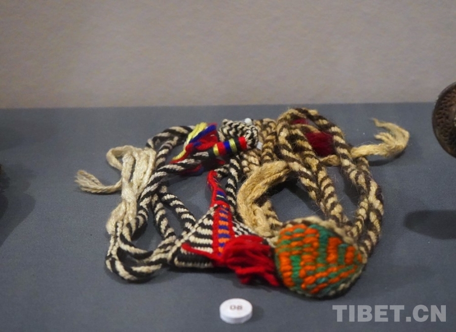 圖為“宗山號角——紀念西藏江孜抗英保衛(wèi)戰(zhàn)120周年主題展”展品——烏爾朵,一種牧民放牧牛羊用的皮制工具,可以把拳頭大小的石頭裹起來甩出去,用以驅趕或圍攏牲畜。攝影:王茜