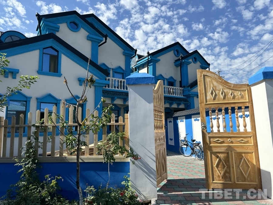 圖為喀贊其老街內(nèi)隨處可見的“伊犁藍(lán)”建筑 攝影:楊眉笑