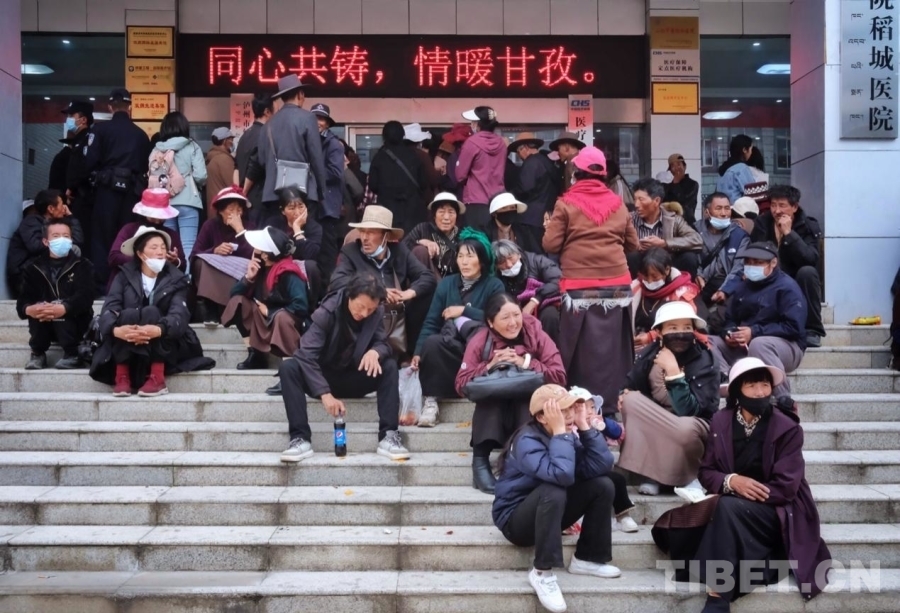圖為7月8日,在稻城縣人民醫(yī)院門口,當(dāng)?shù)厝罕娫诘却刑?、分診