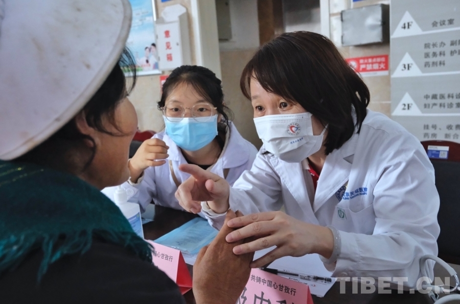 醫(yī)院大廳內(nèi),“同心共鑄·情暖甘孜”的紅色橫幅格外醒目。來自首都醫(yī)科大學(xué)附屬北京天壇醫(yī)院、北京宣武醫(yī)院、北京婦產(chǎn)醫(yī)院等單位的專家正在為當(dāng)?shù)厝罕姍z查、問診。