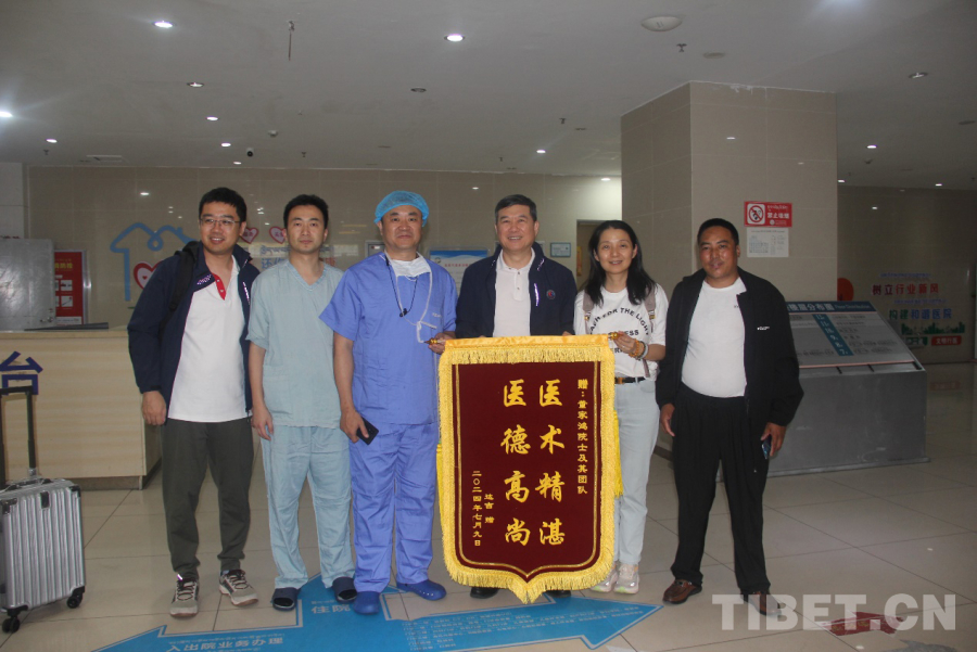 圖為甘孜州人民醫(yī)院肝膽科主任給董家鴻院士送錦旗 攝影:聶文飄