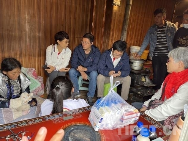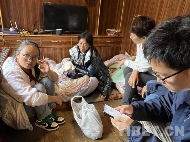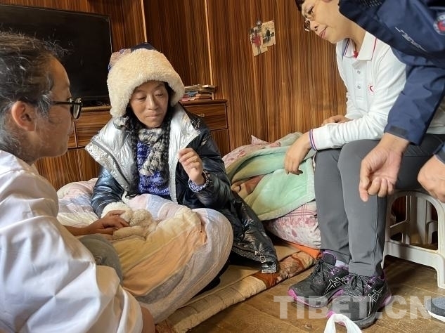 在義診活動進行的同時,幾位專家還分撥前往貧困家庭慰問。其中,北京地壇醫(yī)院的中醫(yī)科副主任楊玉英,北京地壇醫(yī)院婦科副主任劉軍,北京老年醫(yī)院呼吸科副主任劉前桂,北京大學第一醫(yī)院骨科副主任徐貝宇一行來到了離措拉鎮(zhèn)不遠的德西村山坡上,去阿珍家慰問看診。據(jù)了解,阿珍的母親沖曲措于 2019 年進行了胃癌手術,術后做了五次化療,于 2020 年末完成化療。然而,2024 年 6 月份,沖曲措又被查出患有肺炎。由于吃不下飯,沖曲措體重嚴重下降,營養(yǎng)嚴重不良。。