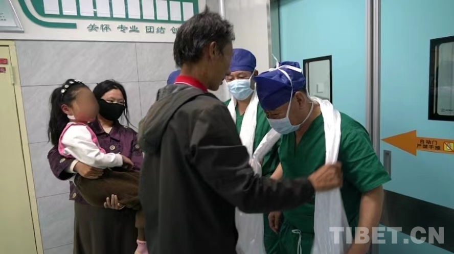 圖為7月10日,手術(shù)成功后,患兒家長為醫(yī)療專家獻上哈達表達感謝 攝影:周晴晴