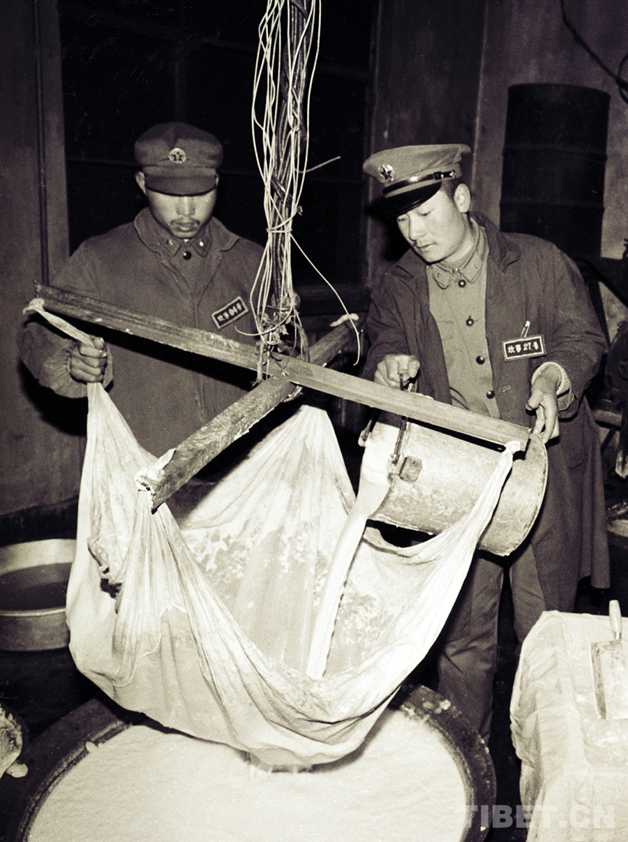 五道梁兵站戰(zhàn)士正在制作豆腐。在風雪青藏公路線上,它豐富了過往人員就餐的“菜盤子”(唐召明1987年攝)