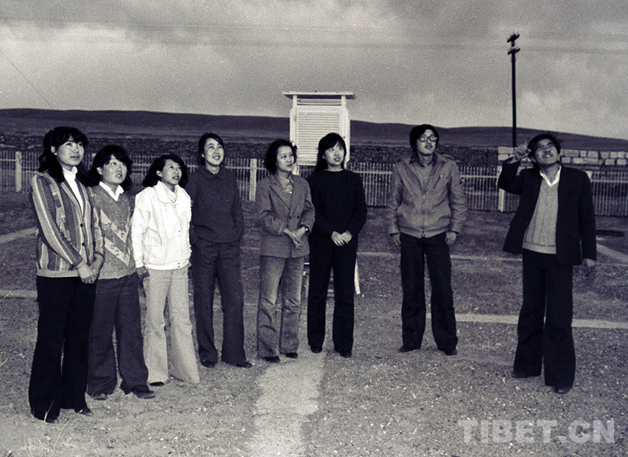 五道梁氣象站副站長尹憲志(右一),在向同事介紹當?shù)貧庀笄闆r(唐召明1987年攝)