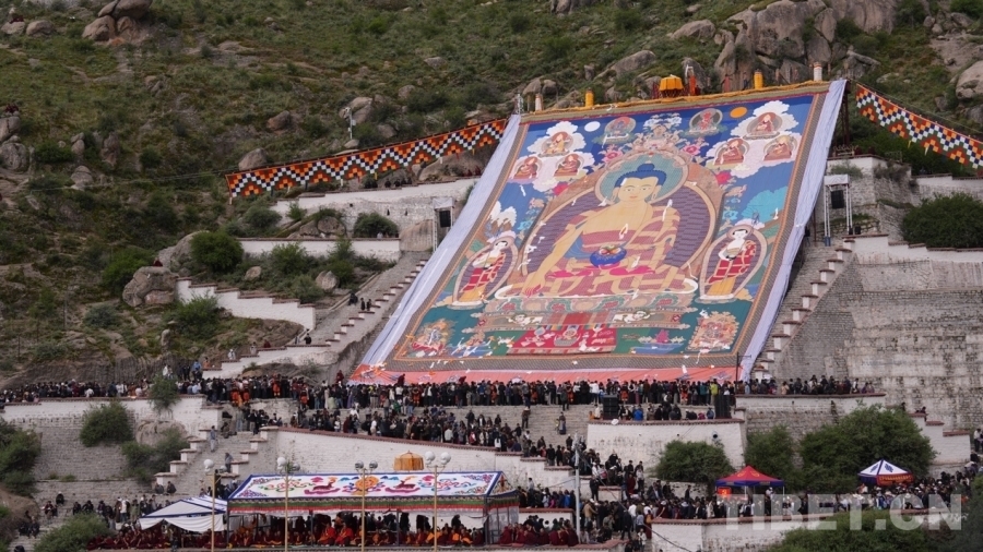 中國西藏網(wǎng)訊 8月4日,哲蚌寺背后的半山腰上,伴著莊嚴(yán)的法號聲,巨幅釋迦牟尼像唐卡緩緩展開,吸引著數(shù)以千計(jì)的信教群眾和來自世界各地的游客,場面蔚為壯觀。