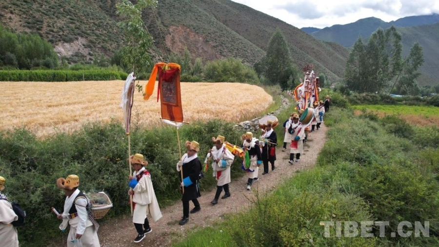 當天清晨,村民們一大早身穿華麗的藏裝,頭戴“次仁金果”、高舉幡旗、身背經(jīng)書、手持青稞麥穗等作物,分成兩隊從村口出發(fā),轉村里的每一塊農(nóng)田進行“收斂地氣、祈求豐收”的巡游活動。浩浩蕩蕩的隊伍傾村而出,大家以不同的口號與詠唱,祈求風調雨順,國泰民安。