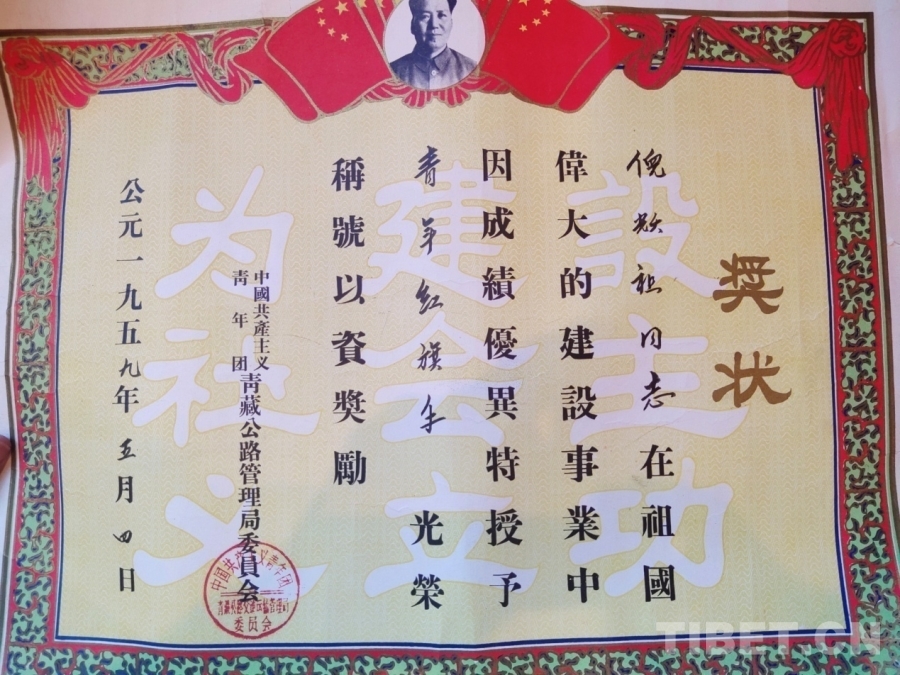 圖為1959年,中國(guó)共產(chǎn)主義青年團(tuán)青藏公路管理局委員會(huì)授予倪躍祖青年紅旗手光榮稱(chēng)號(hào)的獎(jiǎng)狀