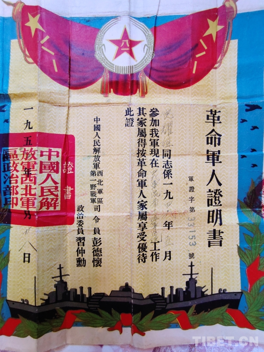 圖為中?國(guó)人民解放軍西北軍革命軍人證明書(shū)