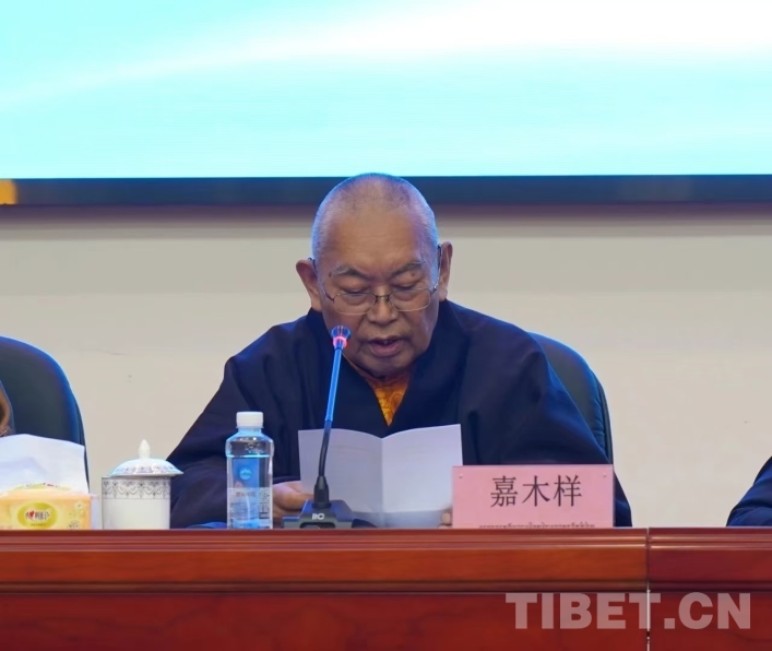 圖為中國(guó)藏語(yǔ)系高級(jí)佛學(xué)院院長(zhǎng)嘉木樣致辭。章淑貞 攝