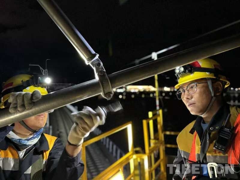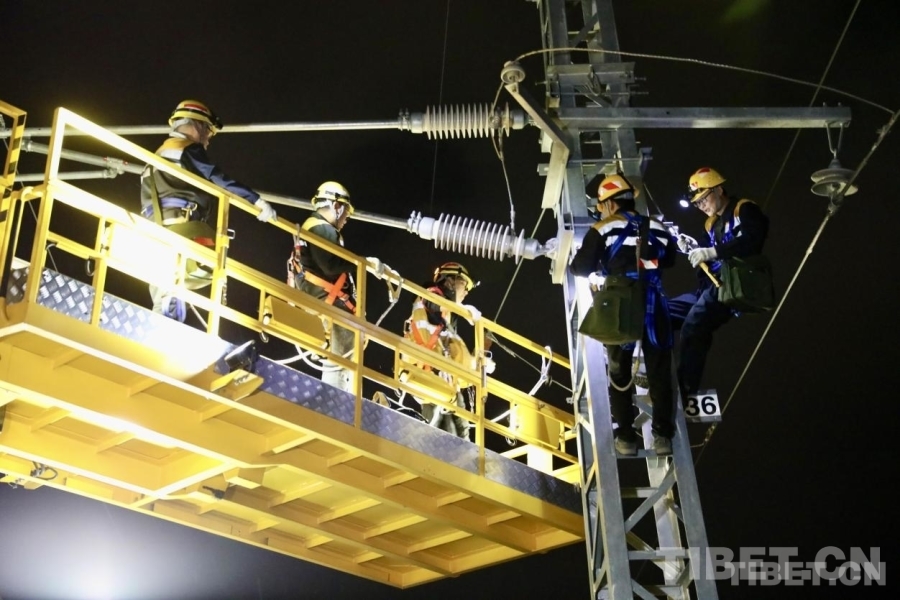 23時(shí)00分,軌道車(chē)穩(wěn)穩(wěn)停靠,“天窗”作業(yè)命令下達(dá)。中國(guó)鐵路青藏集團(tuán)有限公司拉薩基礎(chǔ)設(shè)施段供電維修技術(shù)中心拉薩南接觸網(wǎng)維修隊(duì)工長(zhǎng)李積王帶著7名工友走下接觸網(wǎng)作業(yè)車(chē),驗(yàn)電、連接地線端、接掛地線……一系列操作一氣呵成。隨即,現(xiàn)場(chǎng)負(fù)責(zé)人拉加和工友們依次登上距離地面6米高的作業(yè)平臺(tái)上,穿梭于接觸網(wǎng)線索之間,猶如凌空“舞者”。