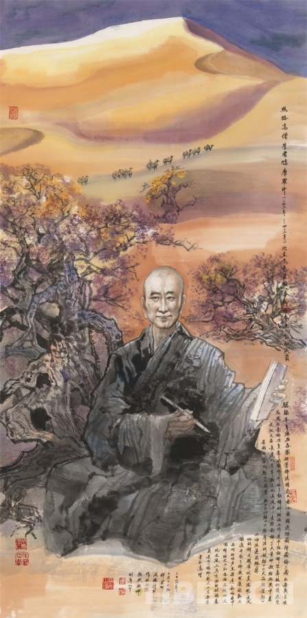 圖為尼瑪澤仁繪制并捐贈(zèng)給鳩摩羅什寺的國(guó)畫作品《絲路高僧學(xué)者鳩摩羅什》