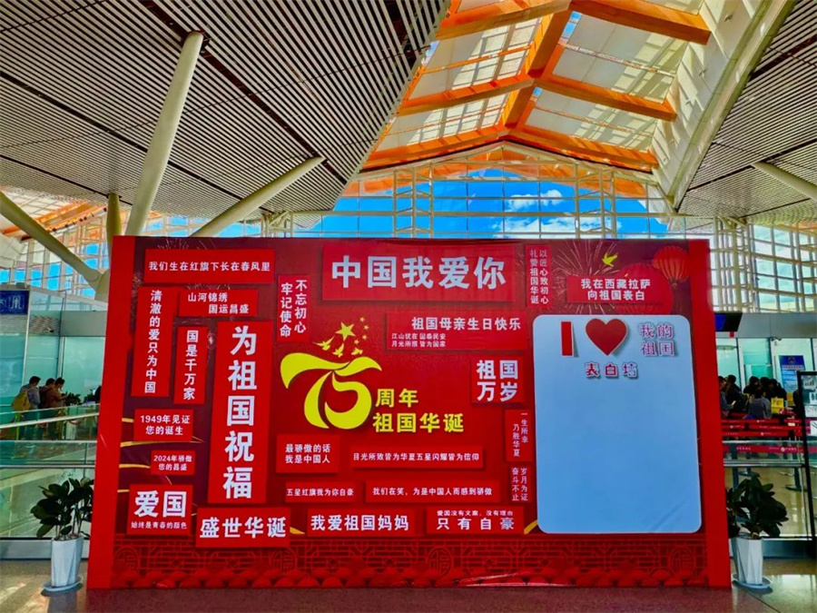 圖為拉薩貢嘎國際機(jī)場(chǎng)T3航站樓內(nèi)設(shè)置的愛國表白墻