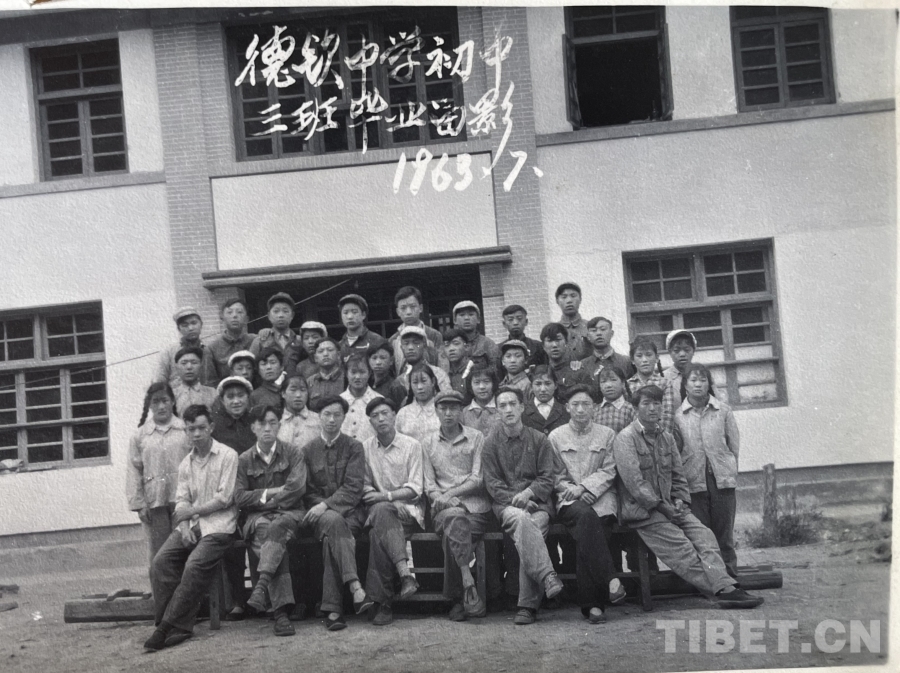 圖為1963年,訪談對(duì)象牛宿光(前排左二)與德欽中學(xué)初中三班畢業(yè)合影 供圖:李志農(nóng)