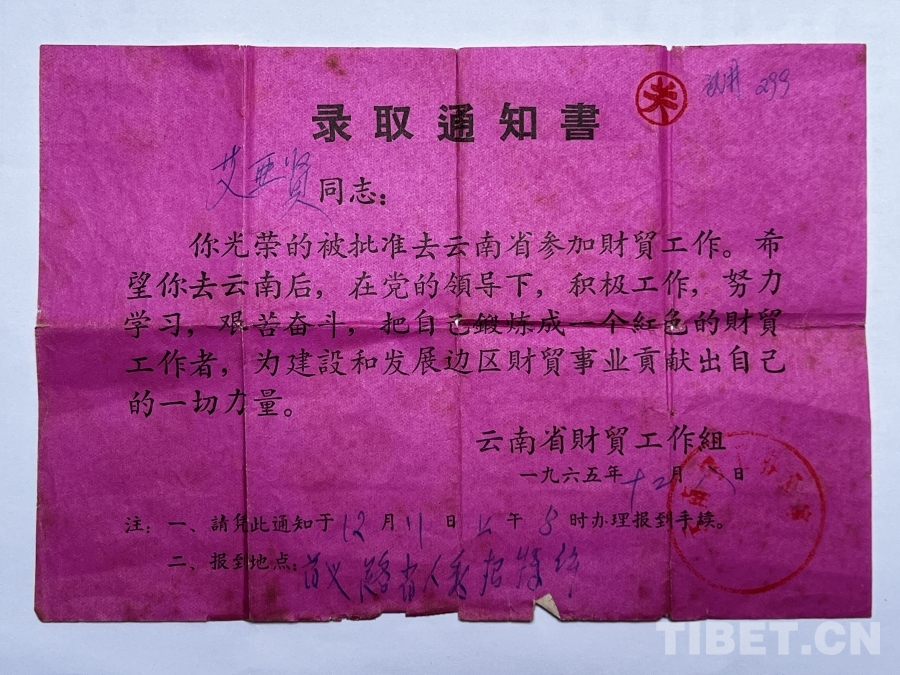 圖為1965年,云南省財(cái)貿(mào)工作組為訪談對(duì)象艾亞賢發(fā)的錄取通知書 供圖:李志農(nóng)