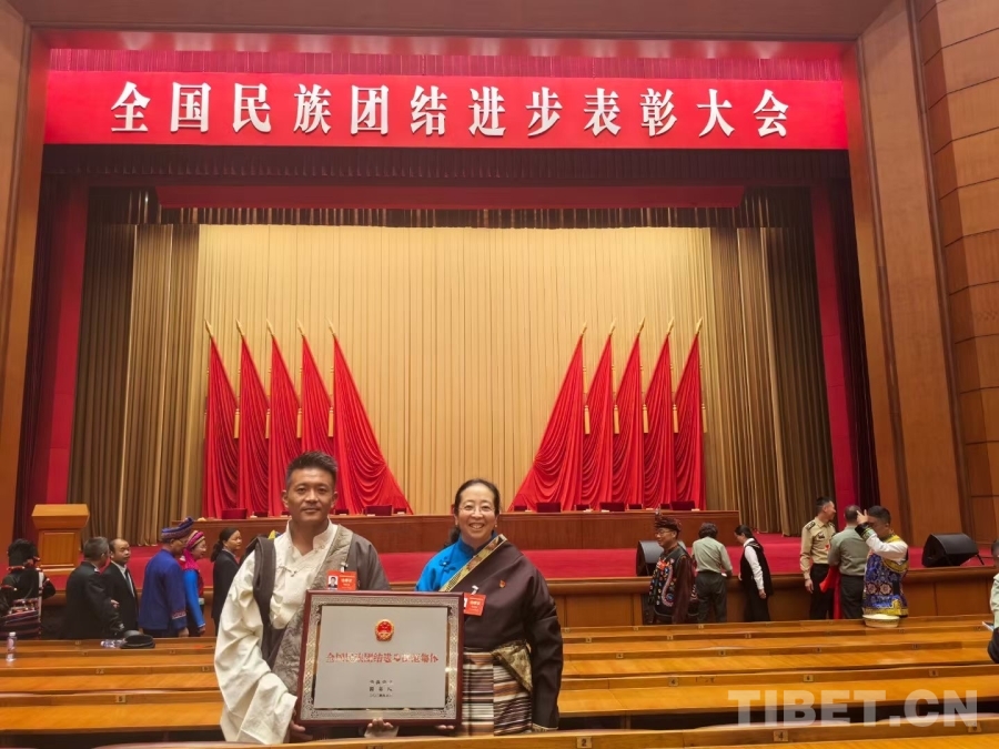 圖為全國民族團結(jié)進步模范集體代表頓珠才嘎與全國民族團結(jié)進步模范個人獲得者次仁拉姆