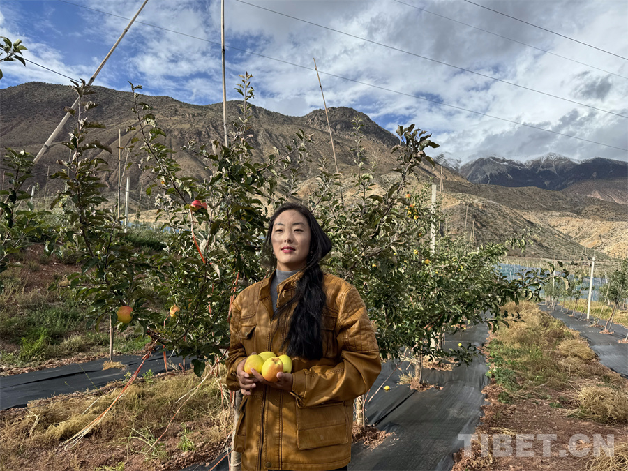 圖為在八宿縣西巴重點(diǎn)經(jīng)濟(jì)林基地工作的嘎桑曲珍正在展示手中的維納斯黃金蘋(píng)果 攝影:王妍丹
