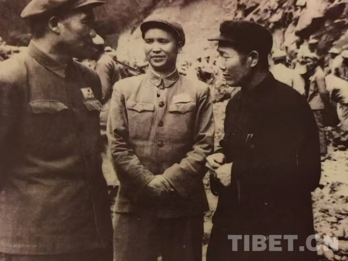 圖為1953年秋,西南軍區(qū)副司令員兼參謀長李達(dá)代表賀龍司令員慰問川藏公路筑路部隊官兵,陳明義(中)、穰明德陪同李達(dá)(左一)在西藏波密視察公路修建進展 圖由陳亦軍提供