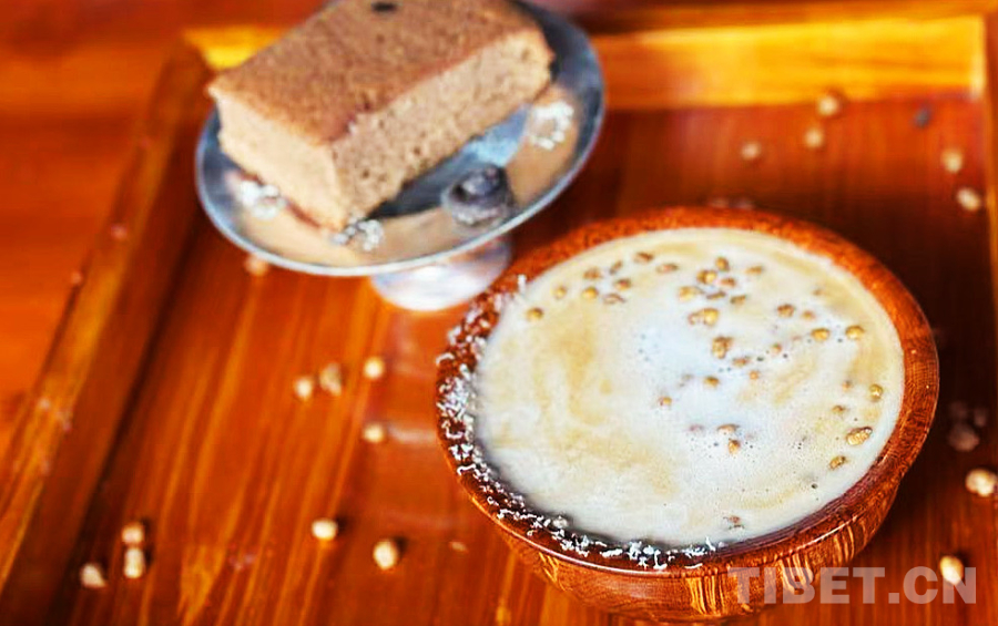 在濃郁的咖啡液里注入青稞奶,撒上當?shù)禺a(chǎn)的酸酸的奶渣和青稞粒——一碗香濃的咖啡完成了。是的,是“一碗咖啡”,索朗群培專門選用了藏族群眾喜愛的傳統(tǒng)木碗用作咖啡杯。