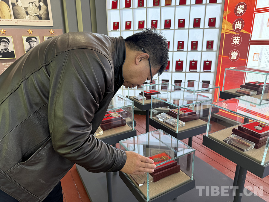 圖為于雁軍在觀看捐贈給博物館的、父親于鳳山的軍功章