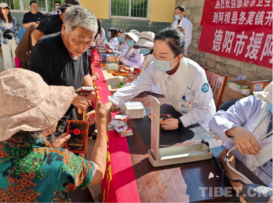 圖為德陽援藏醫(yī)療隊(duì)員和若爾蓋當(dāng)?shù)厝罕姾嫌啊∈茉L者供圖