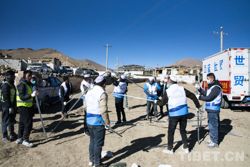 圖為在左措村地震安置點(diǎn)現(xiàn)場,山南市乃東區(qū)甘肅青海企業(yè)家商會愛心人士正在搭建物資發(fā)放帳篷 攝影:趙振宇