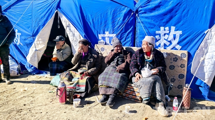 圖為定日縣曲洛鄉(xiāng)左措村安置點前,受災(zāi)群眾在曬太陽 攝影:王淑