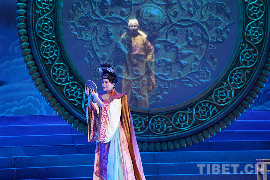 圖為《金城公主》演出現(xiàn)場,和親會(huì)盟遭到破壞,金城公主在迷惘中通過銅鏡得到已故父親的指引 攝影:蘇洋