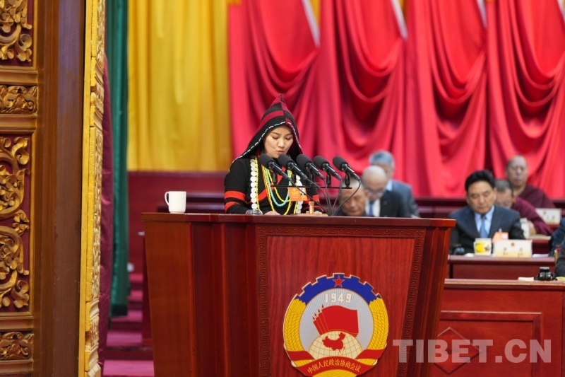 圖為西藏自治區(qū)政協(xié)委員布姆曲珍發(fā)言 攝影:德吉卓瑪