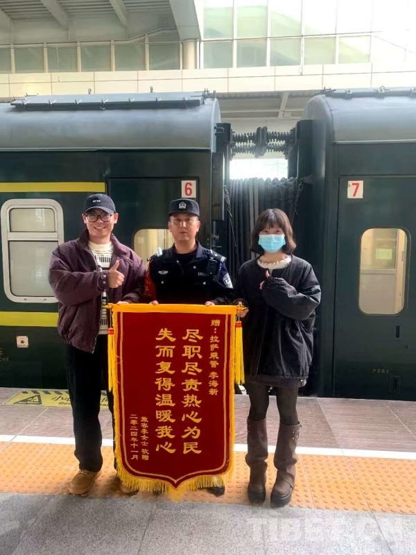 圖為旅客為李警長送錦旗。2024年11月,李警長在列車巡檢時發(fā)現(xiàn)一部被旅客遺失的手機(jī),在與失主取得聯(lián)系后將手機(jī)送還。 受訪者供圖