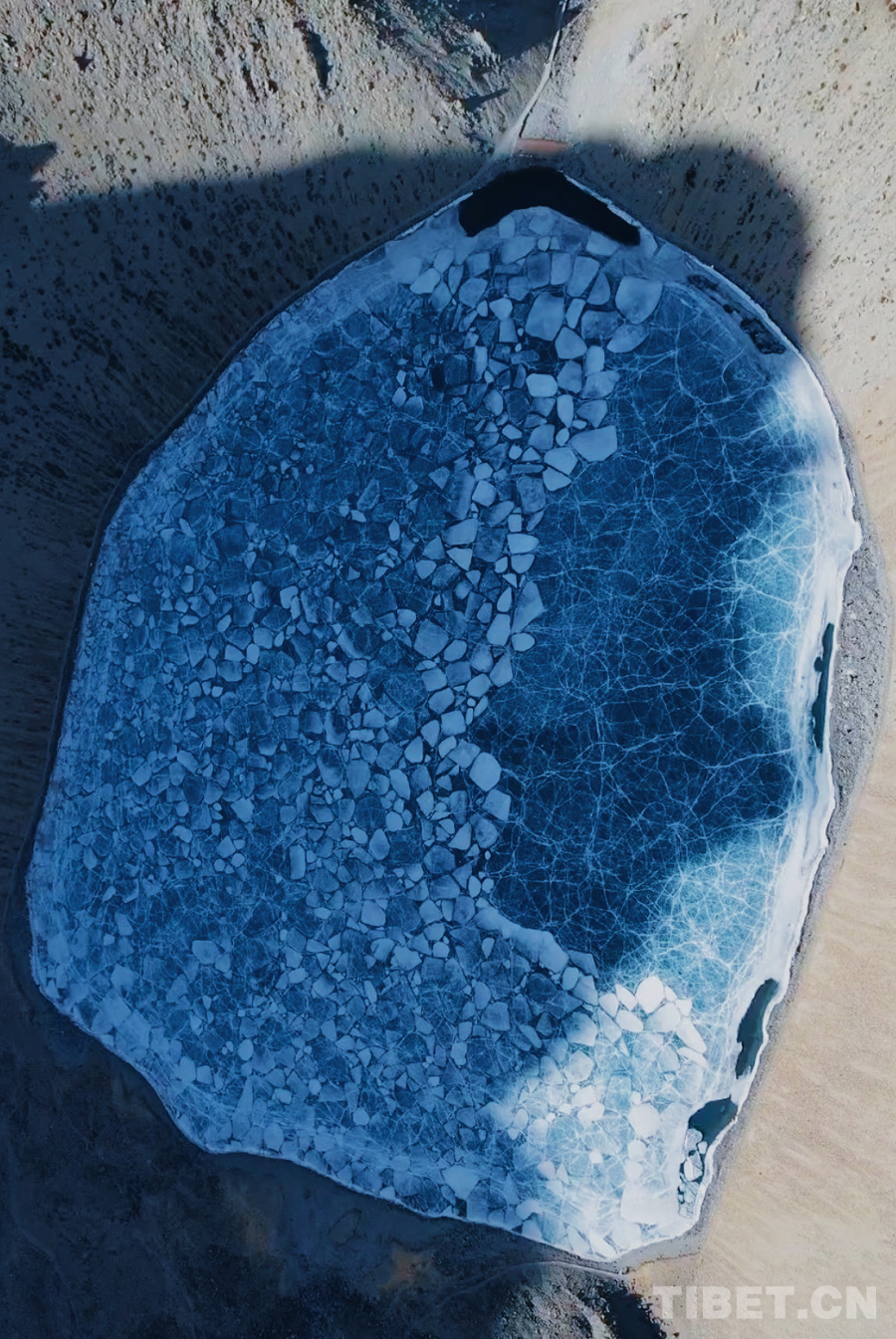 圖為冬日的恰央錯(cuò)湖面結(jié)冰,湛藍(lán)如翡翠,從空中俯瞰如同一個(gè)巨大的“盾牌”,十分壯觀,前來打卡的游客更是絡(luò)繹不絕。攝影:德吉卓瑪