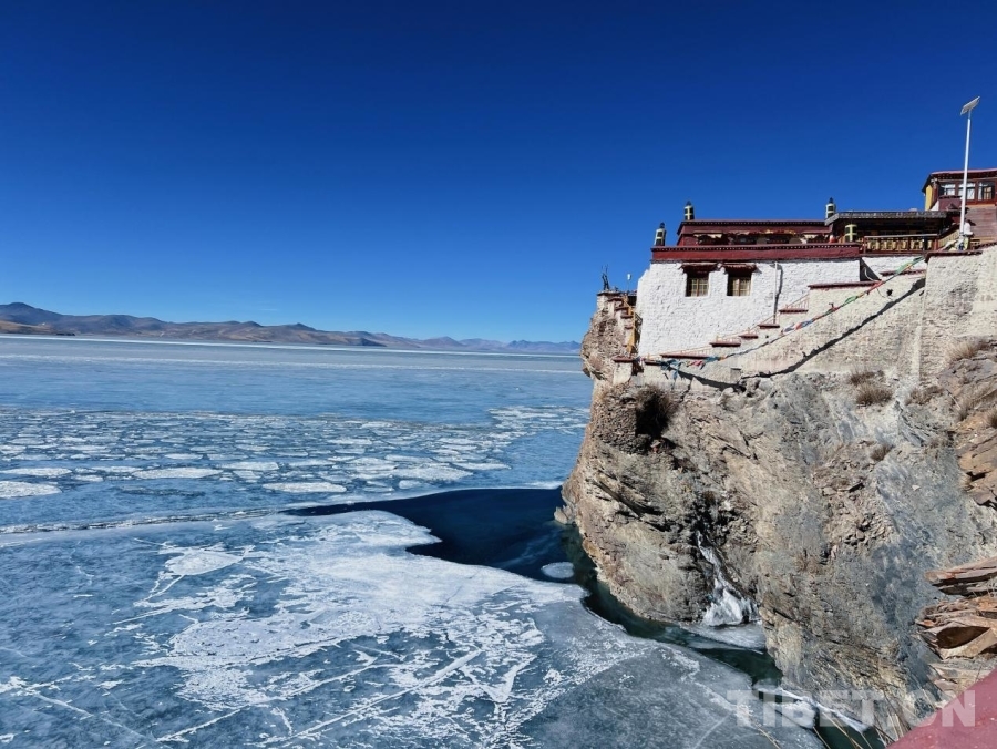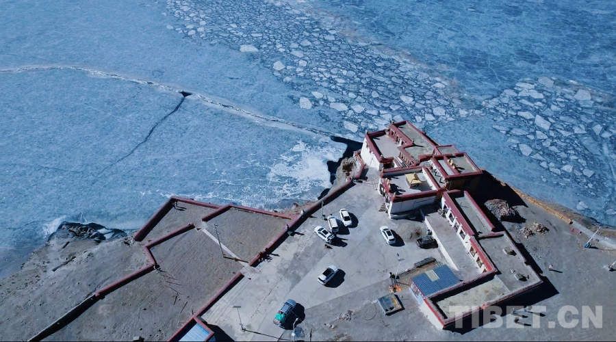 圖為普莫雍錯(cuò)一角化冰,湖面清澈見底,如同一塊翡翠掉落在推瓦寺一旁,美麗動(dòng)人。攝影:德吉卓瑪