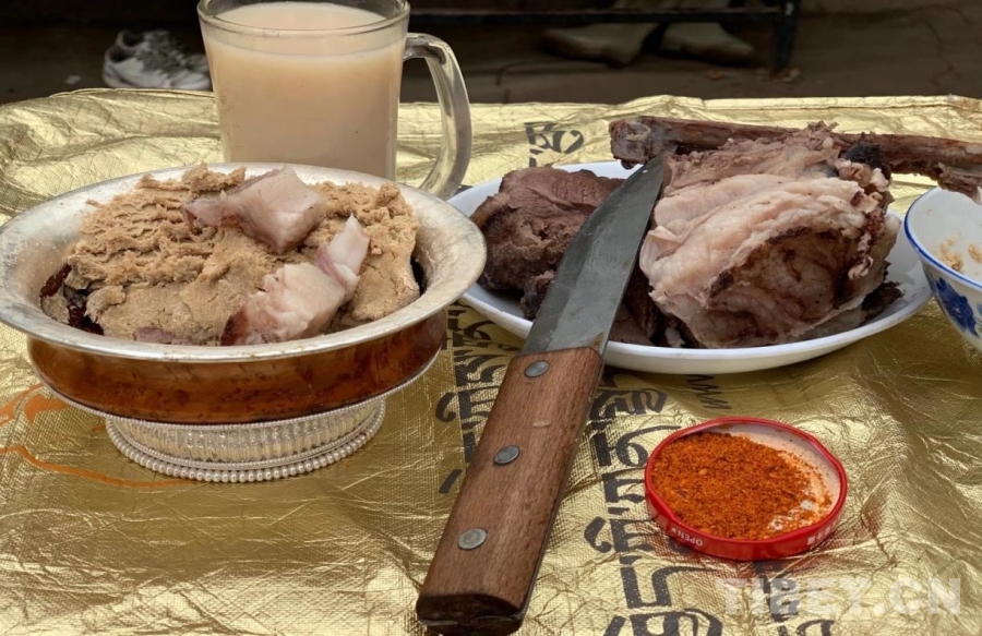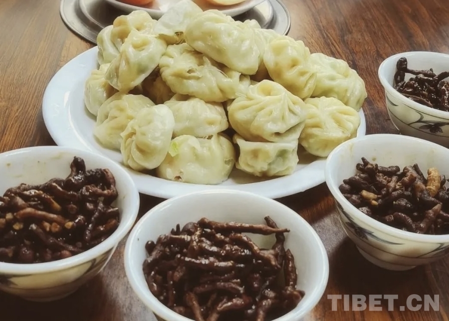 到了中午,我們會(huì)邀請(qǐng)鄰里親戚來(lái)家里做客,除了準(zhǔn)備米飯蔬菜,在牧區(qū),主人家還會(huì)煮牛羊的頭來(lái)招待客人。大人們都愛吃肉,年輕人都喜歡吃各類蔬菜。到了下午,我們就會(huì)吃人參果拌酥油,還有肉包子。