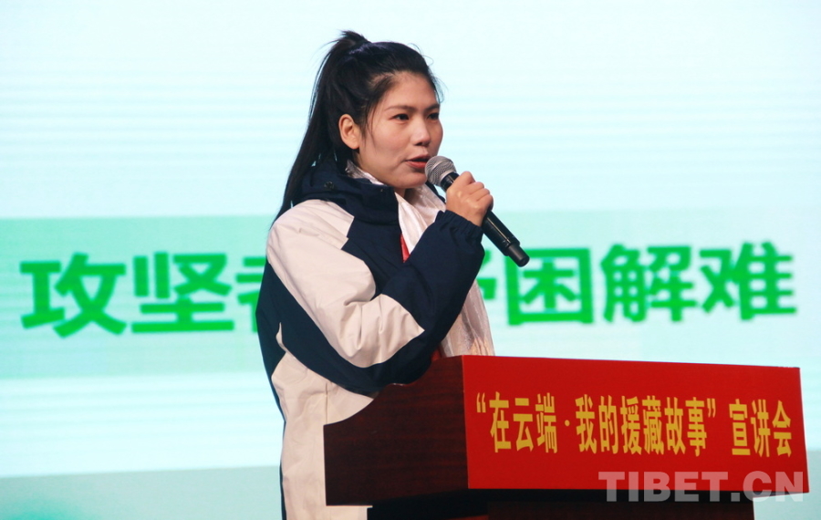 圖為四川省攀枝花市農(nóng)業(yè)農(nóng)村局干部揚秀英講述該局黨組成員、副局長寧秀蓉的援藏故事 攝影:劉莉