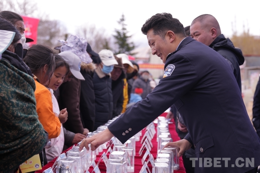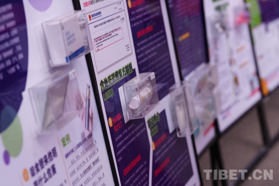 圖為活動現(xiàn)場,禁毒辦民警向群眾普及防毒禁毒知識。攝影:德吉卓瑪
