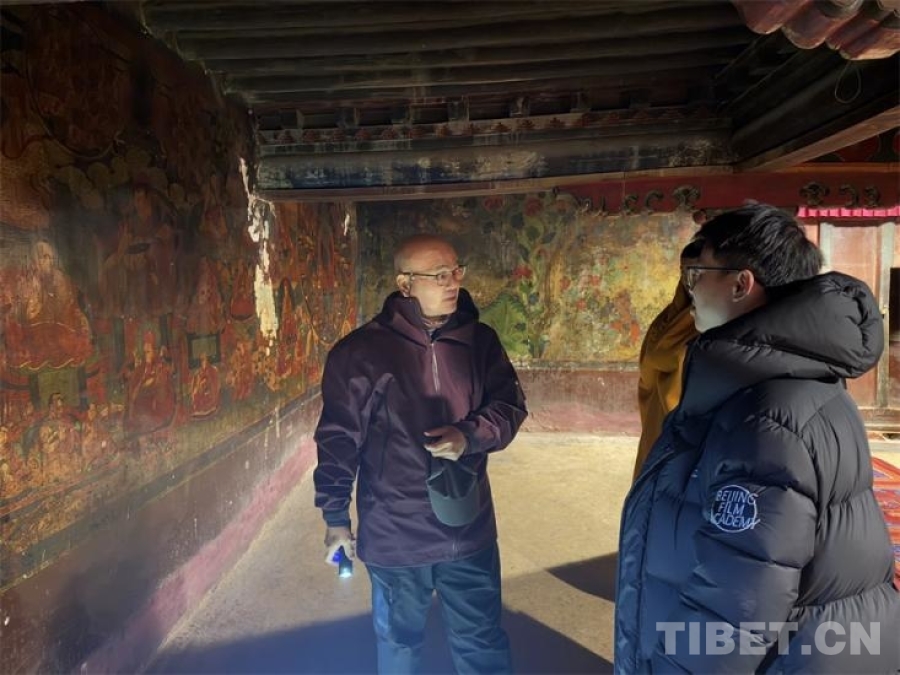 圖為羅文華在薩迦寺內(nèi)認真測繪 攝影:王妍丹