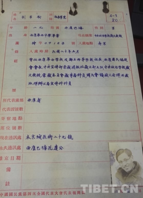 1931年,劉家駒加入中國國民黨,成為早期藏族黨員之一。他不僅出席了中國國民黨四中全會,還參加了國民政府在洛陽召開的國難會議,并將自己的著作《康藏的過去和現(xiàn)在》分發(fā)給與會人士,大聲呼吁大家重視康藏工作。同年11月21日,“西康旅京同鄉(xiāng)國防救亡會”成立,劉家駒被選舉為會長,在9名執(zhí)行理事中,有6名是藏族,分別為劉家駒(格桑群覺)、江安西(洛松鄧珠)、馬定西、佛平西、楊紹西、馮云仙(女)?!秶勚軋?bào)?名人錄》第8卷20期專門對時(shí)年29歲的劉家駒進(jìn)行了介紹。此時(shí)的他,已經(jīng)是中央政治學(xué)校(蒙藏政治訓(xùn)練班)的藏文教授,在教育領(lǐng)域發(fā)揮著重要作用,為培養(yǎng)了解藏族文化和語言的人才貢獻(xiàn)力量,為邊疆治理提供智力支持。