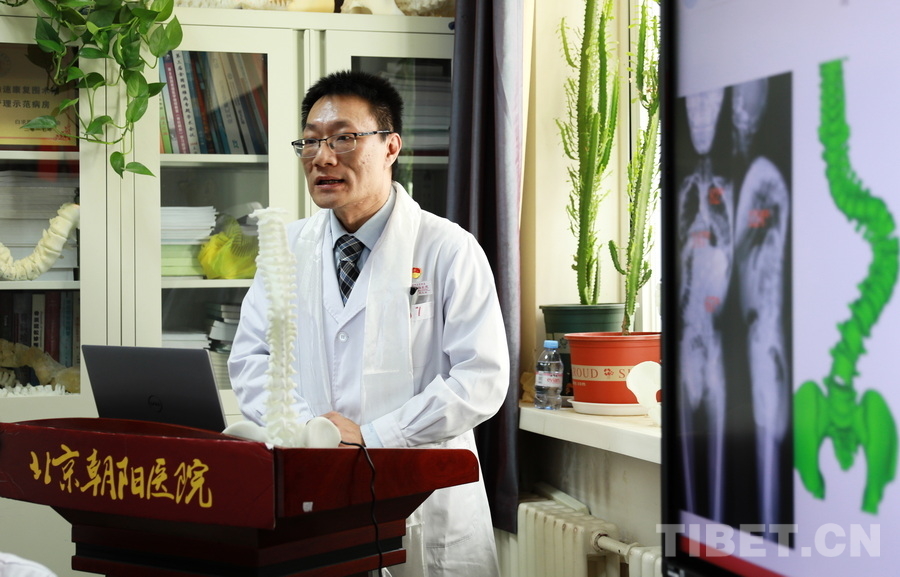 圖為北京朝陽(yáng)醫(yī)院骨科主任、首都醫(yī)科大學(xué)骨外科學(xué)系主任、國(guó)際腰椎研究學(xué)會(huì)候任主席海涌介紹該院骨科團(tuán)隊(duì)在救治高海拔地區(qū)脊柱側(cè)彎患者方面所做的工作 攝影:劉莉