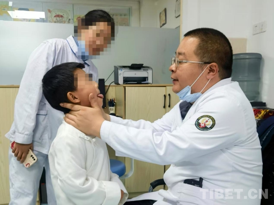 圖為火箭軍特色醫(yī)學(xué)中心口腔科主治醫(yī)師張曉然(右)正在為舌系帶畸形患兒查體