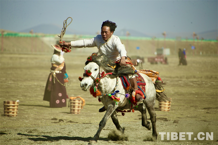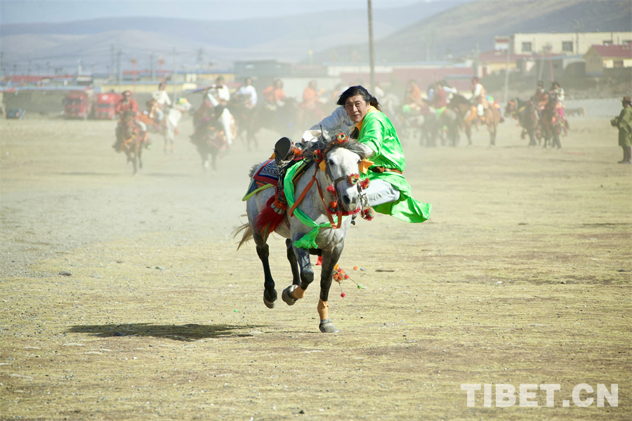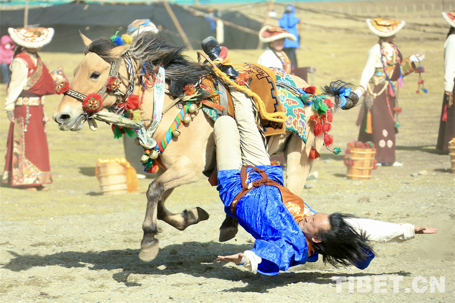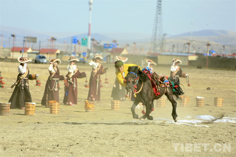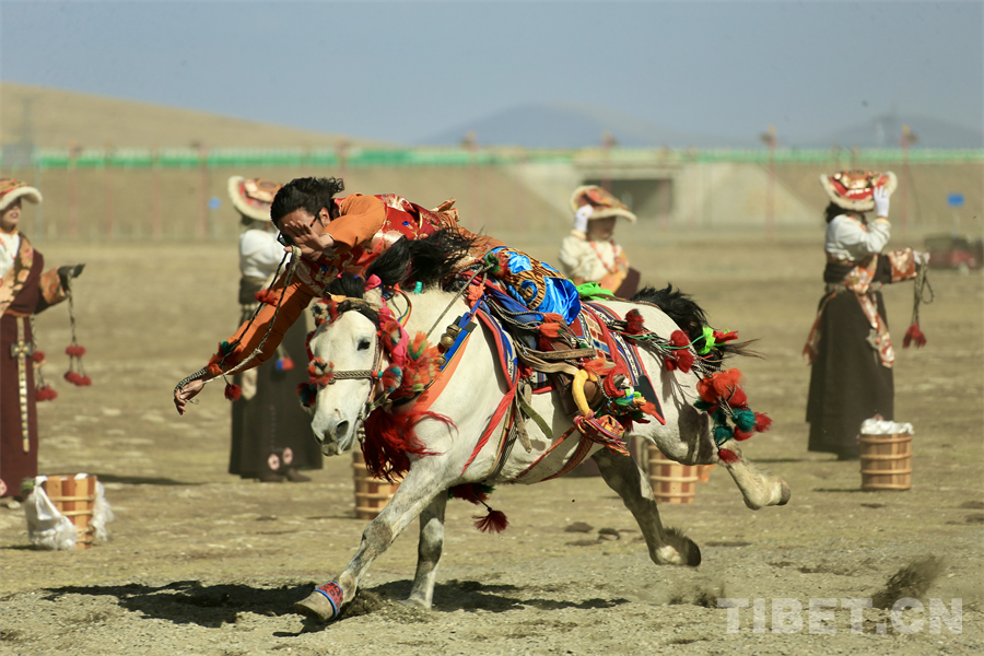 在海拔4000米左右的遼闊天地間,康巴漢子們駕馭著矯健的駿馬、身著華美的傳統(tǒng)服飾,如疾風般掠過金色的草原,在馬背上展示跑馬射箭、乘馬射擊、跑馬拾哈達、跑馬倒立、跑馬懸體等高難度動作,馬蹄聲聲、歡呼陣陣,交織成高原最豪邁的樂章。(中國西藏網(wǎng) 記者/畢然 龍真多吉)