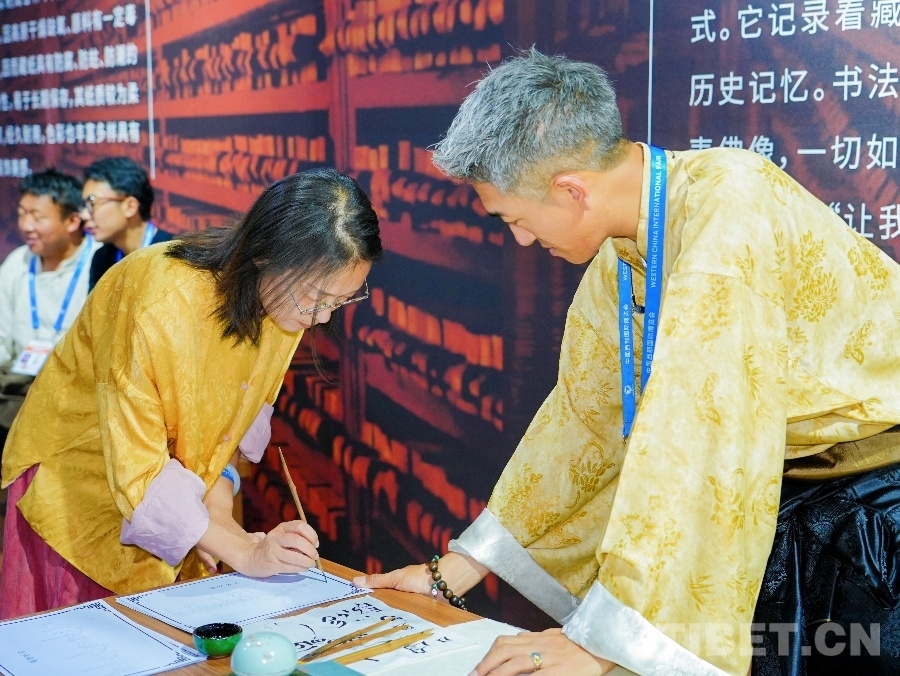 圖為參觀者正在現(xiàn)場體驗藏文書法