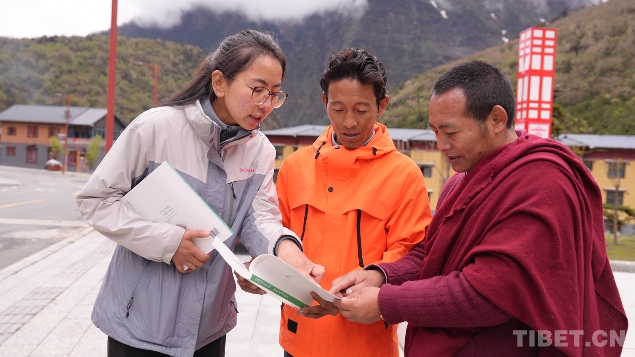 圖為西藏自治區(qū)藏語委辦(編譯局)工作人員為玉麥鄉(xiāng)群眾指導學習方法