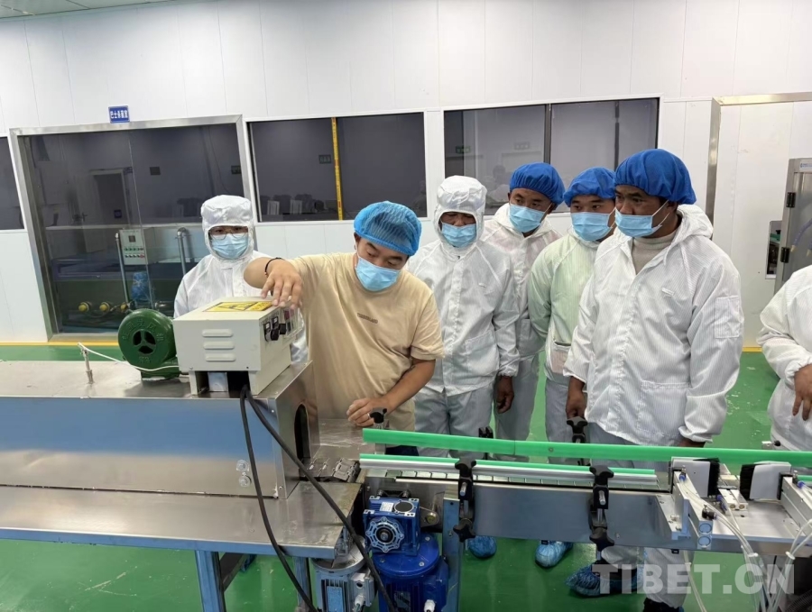 圖為生產(chǎn)車間里,巴桑旦增正專注調(diào)試設備,身旁同事們認真觀摩學習