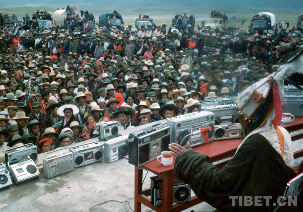 圖為說唱藝人阿達(dá)在那曲賽馬會上說唱《格薩爾》的傳奇故事,臺上擺滿了牧民群眾的各式錄音機(jī)(唐召明提供,才龍1987年前后攝)